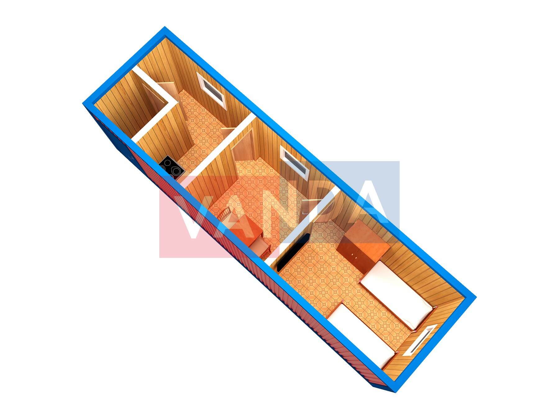 Блок контейнер «Север» №4 (вариант 1) изготавливается из несущего каркаса (верхняя и нижняя обвязка): швеллер 140х50х3 мм., угловые стойки: сложно - гнутый угол 150х130х3 мм., крыша блок-контейнера: металл сварной 1,4 мм., качественная наружная отделка: профлист с полимерным покрытием, внутренняя отделка стен: Вагонка деревянная, внутренняя отделка потолка: Вагонка деревянная, вспомогательный деревянный каркас (стены): обрезная доска 40х150 мм., лаги пола: обрезная доска 40х150 мм., лаги потолка: обрезная доска 40х150 мм., выполнено утепление: Минеральная вата «ISOVER» – 150 мм. и пароизоляция: изоспан А, В, черновой пол состоит из: оцинкованный гладкий лист, доска обрезная 20 мм. крашенная (2 сорт), чистовой пол покрыт: ДСП строительное 16 мм., отделка пола: линолеум полукоммерческий. Контейнер комплектуется окнами: ПВХ однокамерное, одностворчатое, п/о 900х1100, входной дверью: металлическая, утеплённая (Россия) и внутренними дверями: МДФ (при наличии перегородки). Если в БК присутствуют перегородки, то для них используется: брусок 40х50 мм. В блок контейнере есть электро-обеспечение: электрика в кабель канале с УЗО.